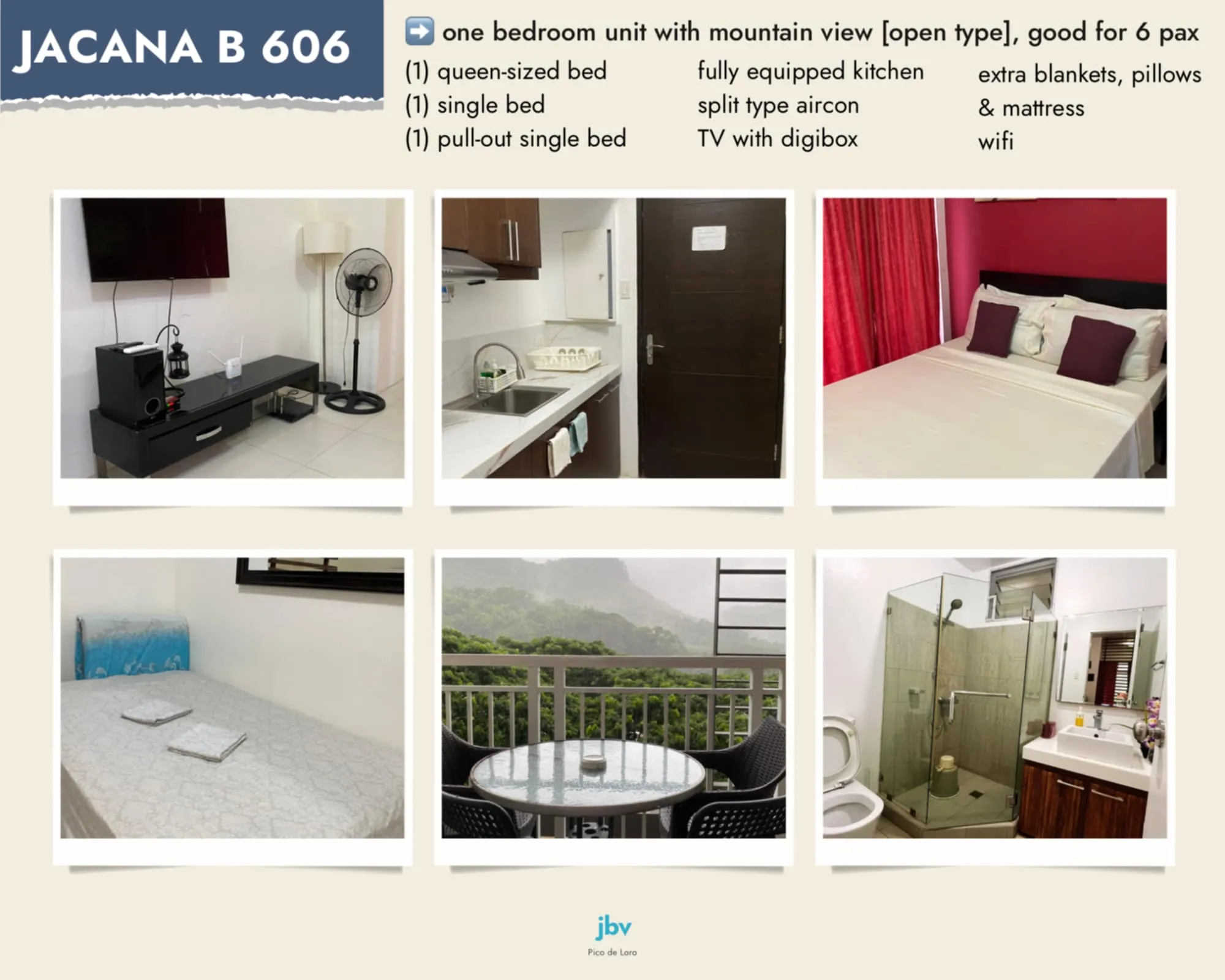 Feel free to choose the condo unit you like at JBV Pico de Loro Units! With captivating views of the mountains and Pico de Loro Beach, our inviting accommodations cater to your preferences and budget. Experience the beauty of the Pico de Loro Resort and enjoy our selected pet-friendly unit options.
